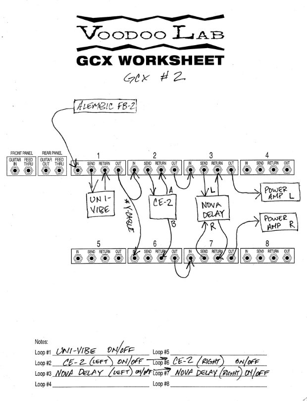 Here are diagrams for both GCXs running everything in the order as you've listed them. GCX #1 is pretty straight forward with eight pedals wired in series routed to the front of the FB-2 preamp. I wasn't quite sure about the GE-7s since the rig you are after had them all over the place as well as that they were all modded. I think here you will likely be switching between one or the other or none rather than both on at once. ...but please experiment and let your ears decide what sounds right!